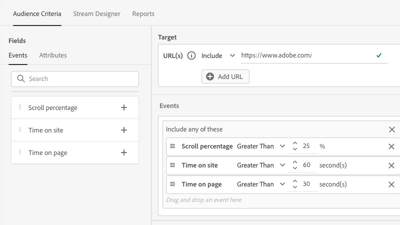 Chatbot Events: Leverage more detailed behavior data for web visitors such as time on page, time on site, and page scroll percentage to define when a Dialogue should be shown. Learn more.
