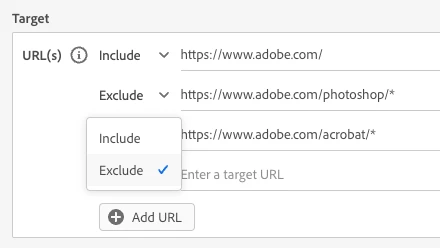 Exclude URLs: Control which of your webpages Dynamic Chat appears on with the ability to exclude specific URLs from targeting criteria. Learn more.