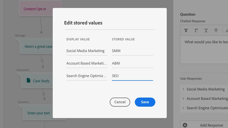 Change Stored Value for Mapped Attributes: Store a different value in the database than what is being displayed to visitors in the chatbot for mapped attributes in Question card. Learn more.