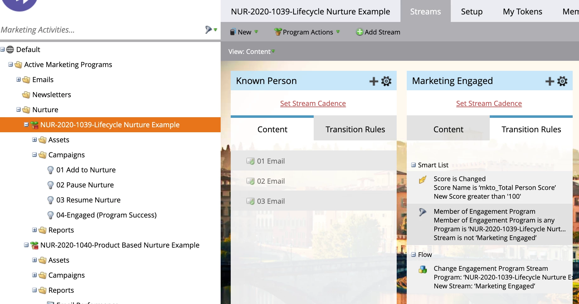 | Do you prefer using the transition rules for adding people to a stream or can you recommend using a traffic cop? | The options are to use transition rules or smart campaigns. I prefer smart campaigns when you need to control or add additional flow steps. Transition rules are great for standard nurtures where it's a series of email assets being sent at a set cadence, with clear definitions of when a person should move from one stream to another. |