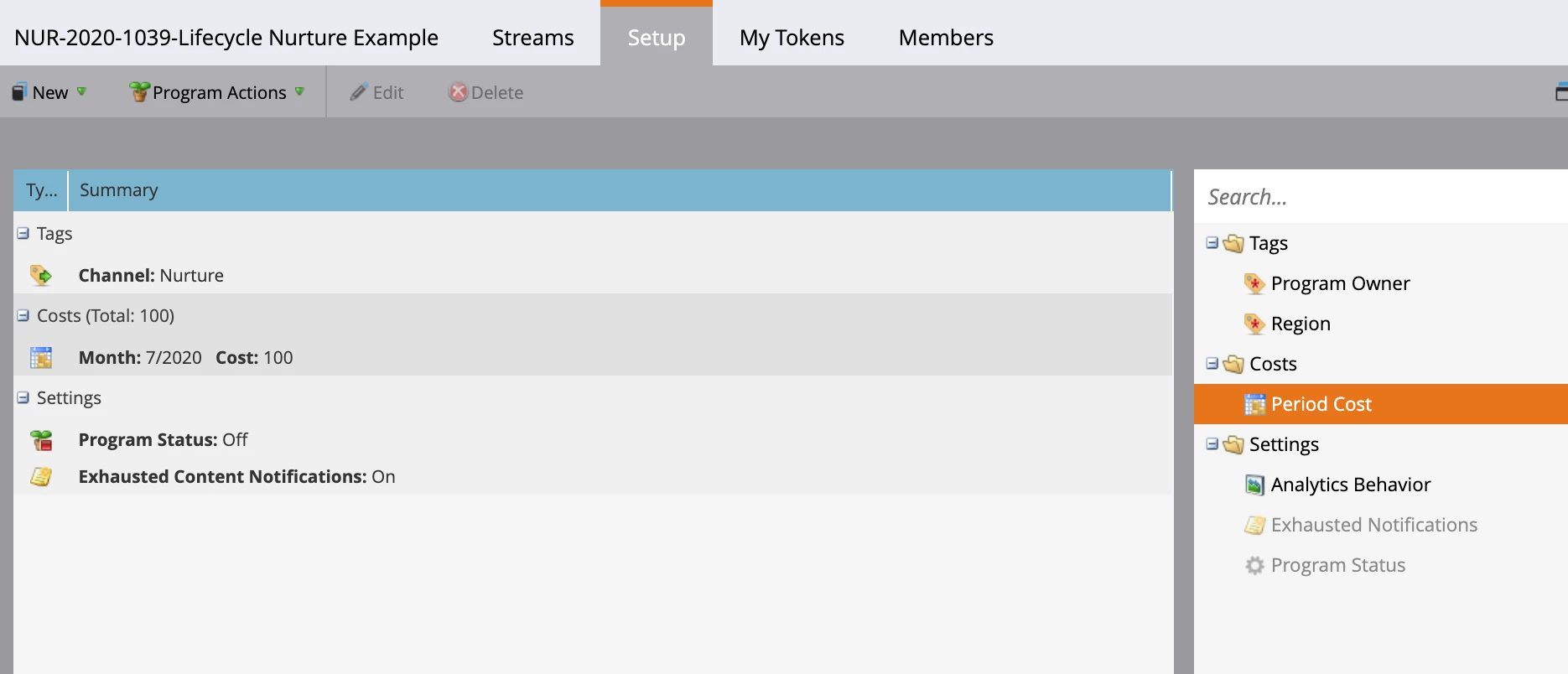 Period costs are used when you want to associate a cost to an program across a specific time period. You can add a period cost to in an Engagement program in the setup tab. A deep dive on period costs is available here.