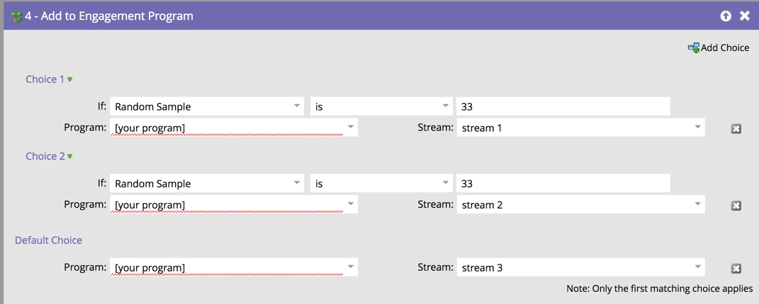 I would like to test the order of the content, which will be different for each stream. So i would like to sort of get a random sample of the leads that go into the streams, and eventually get data on which stream performs best and which content does best when sent after a certain email, etc.