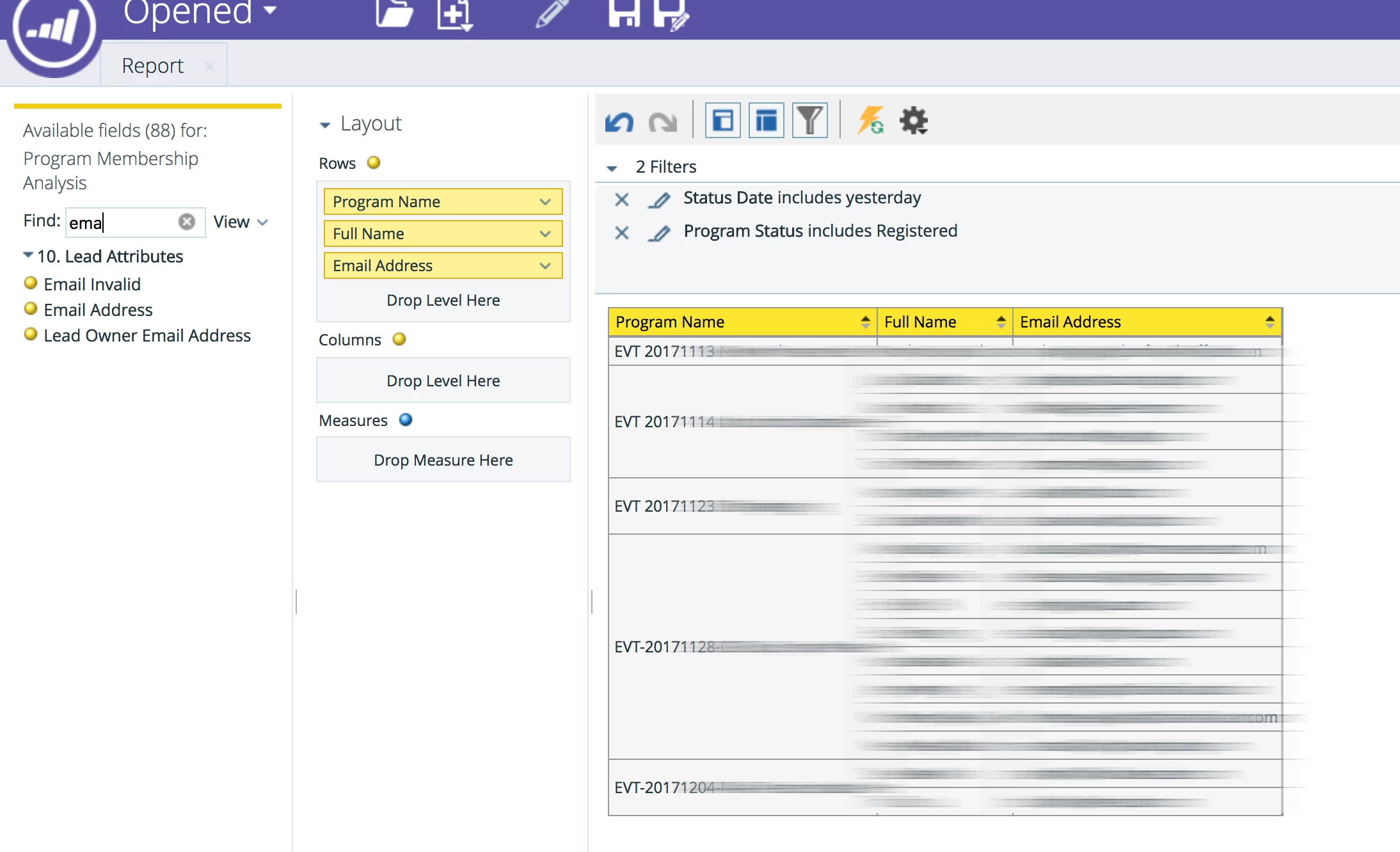 One report of all leads registered for an event - broken down by event