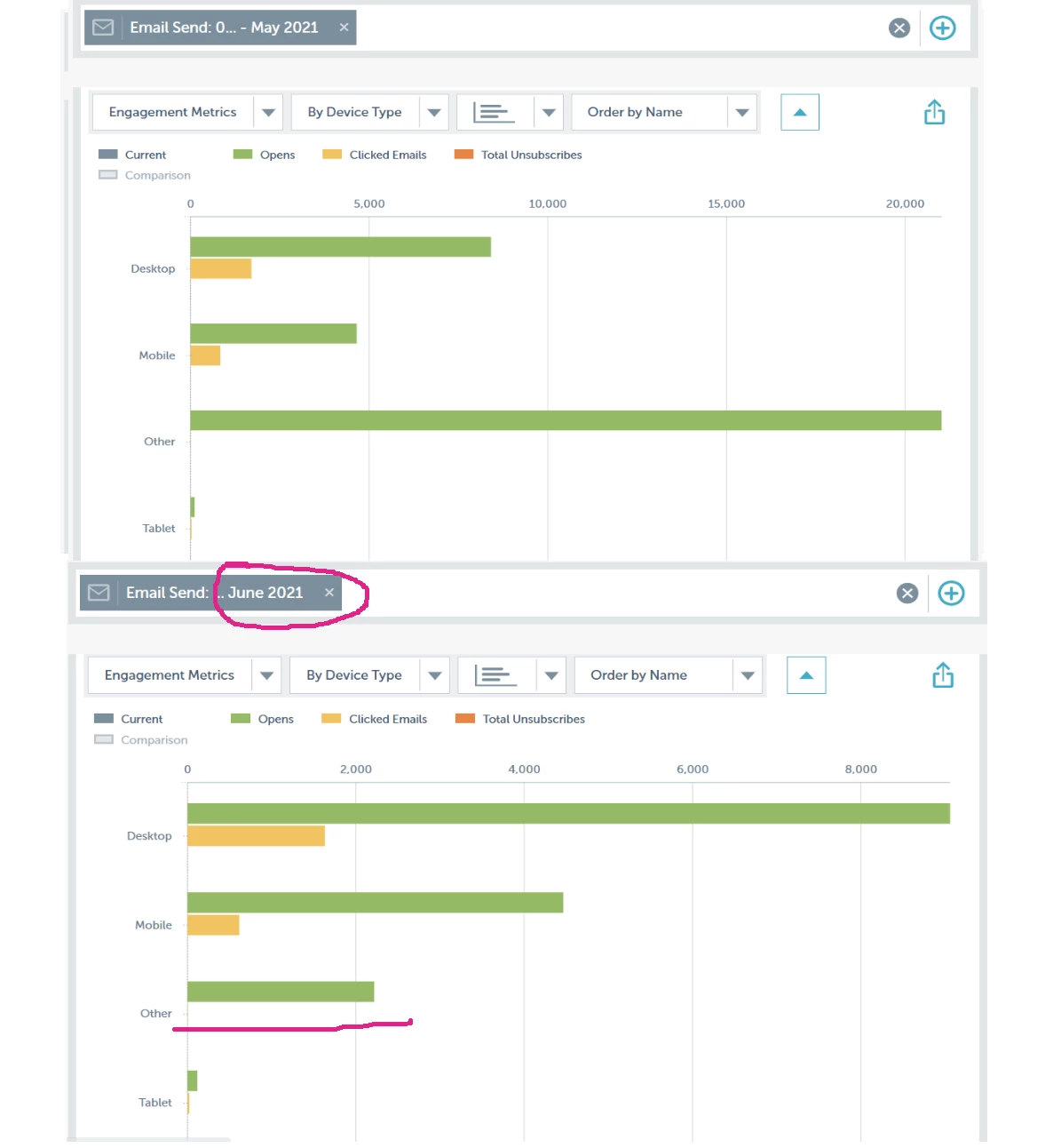 I'm seeing one other change that has happened and I'm wondering if that could be a clue: in the Email Insights view by device type, we used to have the majority of "Open" events under the "Other" platform. Now, we have way less opens in the "Other" category, but more in "Desktop". Is it possible that the open event tracking has changed?
