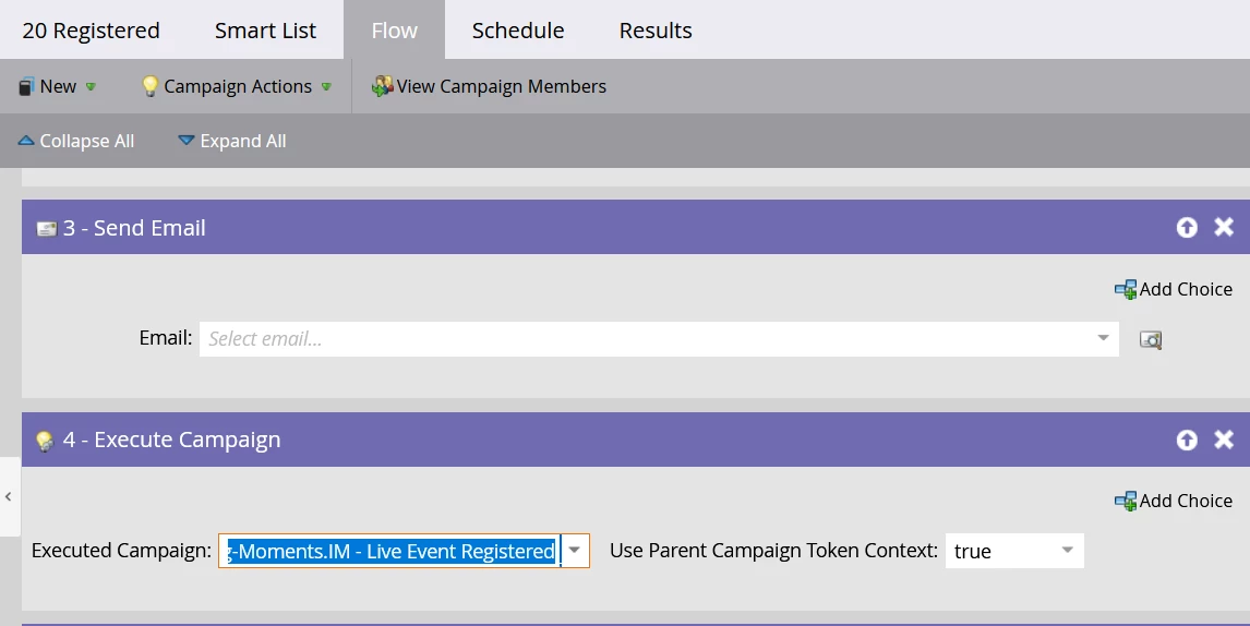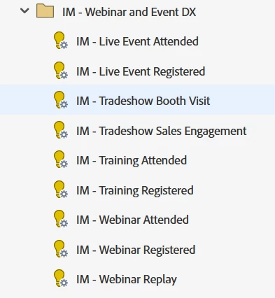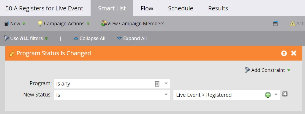 Create an operational program that will store your Interesting Moments, as you would if you were using the trigger-based approach. For Interesting Moments that listen to non-program activities, you will continue to use triggers as before. Within this Interesting Moment program, create the program-based Interesting Moments as Executable Campaigns. You can choose to filter these Executable Campaigns in the Smart List or keep them open (without Smart List criteria). The example below are interesting moments for event engagements.