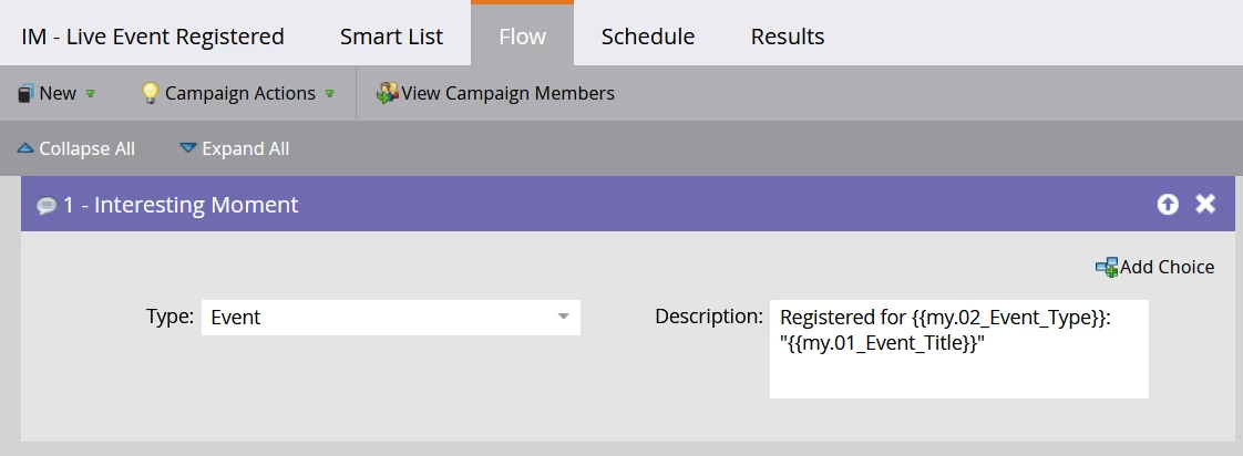 Within the Executable Campaign in the Flow, add the Interesting Moment flow step and use your approved Interesting Moment syntax and the token name for the Interesting Moment elements contained in the program template used to execute this tactic. Note that the {{my.Tokens}} used in this Interesting Moment flow step must be present in the program that you use as the context for your Execute Campaign flow step.