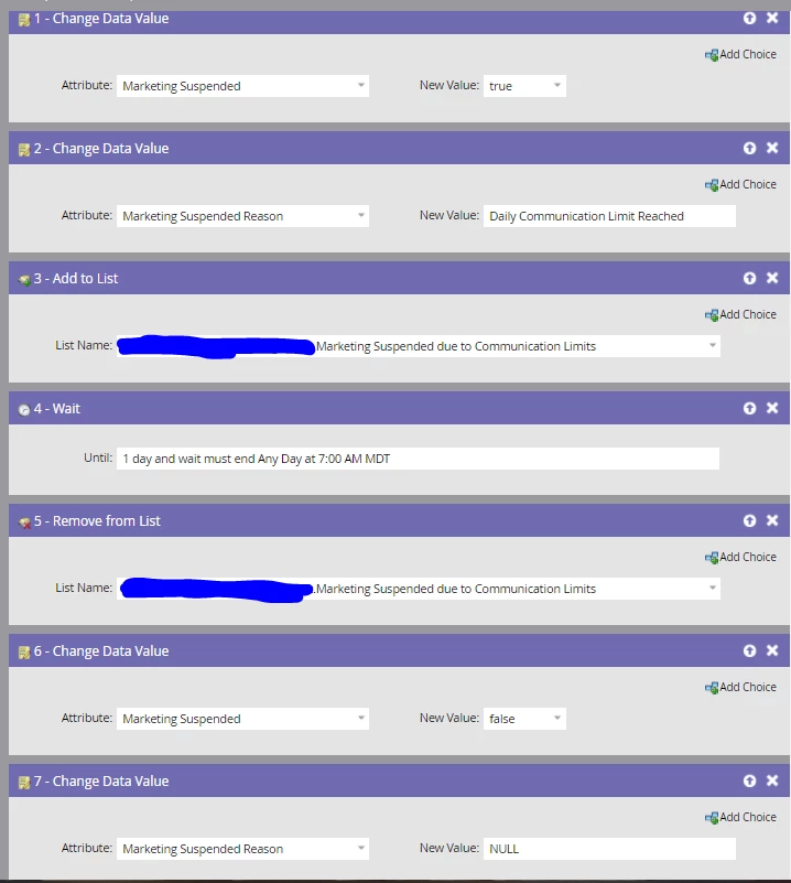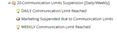 The flow for each of these smart campaigns is below. The following workflow is set up for the daily limit smart campaign flow. The weekly limit suspension is similar, with the exception of the wait period and the suspended reason labeling that the weekly limit was reached.