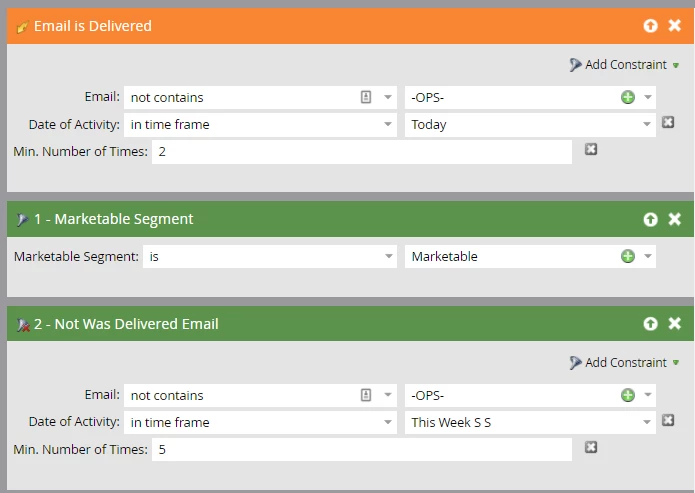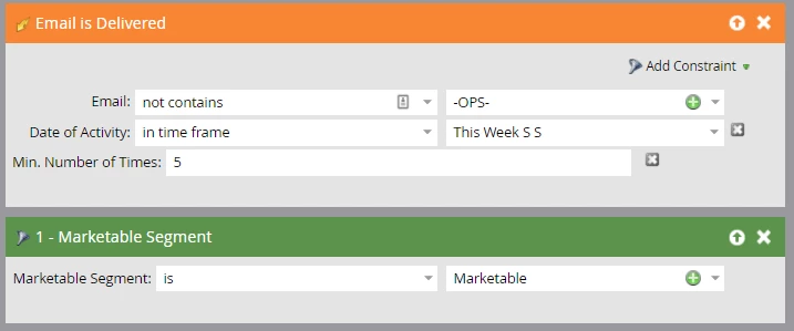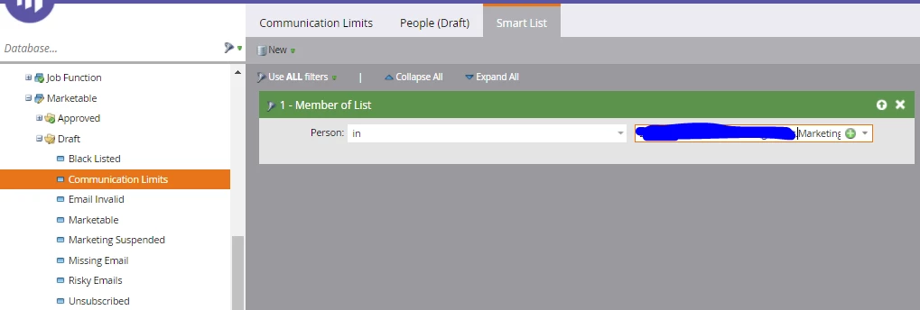 Finally, if your marketable segment is set up to differentiate your unmarketable reasons, you can use a Member of List filter in a segment labeled “Communication Limits” to segment these persons in your marketable segmentation. This step is optional and dependent on how your marketable segmentation is set up.