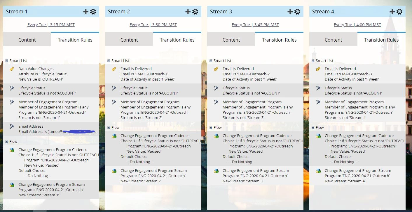 I've created an engagement program where we send leads a different email each week that have a Lifecycle Status of Outreach. Outreach are leads that have shown an interest in our service but have not become a customer yet. If anytime while in the engagement program stream their Lifecycle Status changes from Outreach to Account, they should be removed or paused in the next stream and not receive any further content. We import new leads and updated lead each week to update leads that have changed from Outreach to Account which should pause/remove them from the next stream.