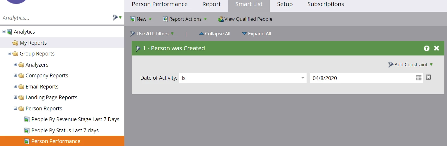 - Create a new People Performance Report in Marketo.