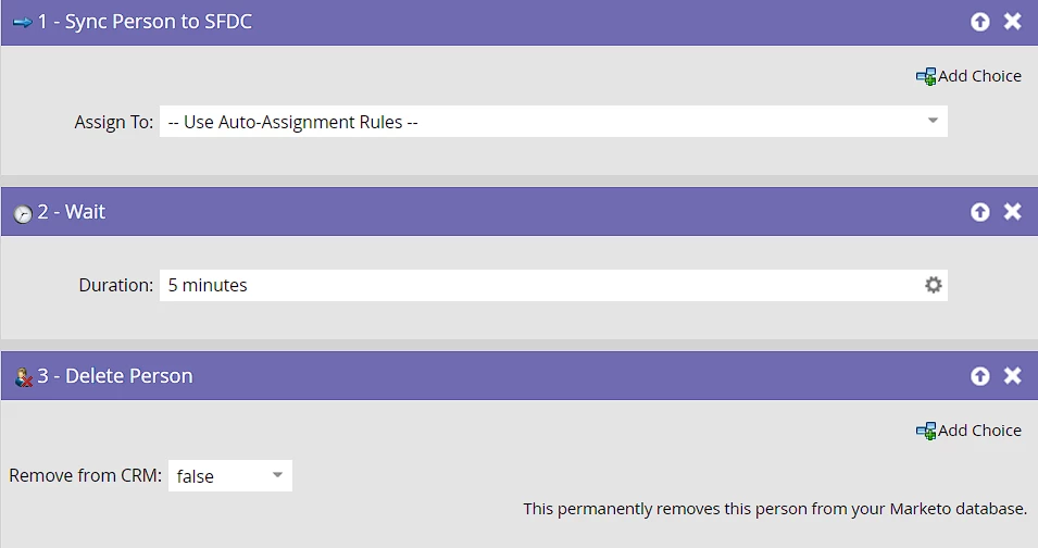 I wouldn't mind throwing in a 5 minutes Wait step before deleting the person from Marketo. Alternatively, you can also use the Executable campaigns for syncing people over to the SFDC and then deleting it using the Delete Person flow step in the parent campaign.