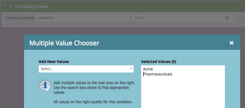 Is there a way around Marketo effectively doing a broad match when using the 'contains' filter? If we have something like Company Name contains "Acme Pharmaceuticals", now it will pull values for either of the two terms, such as "Acme Manufacturing" and "Smith Pharmaceuticals".