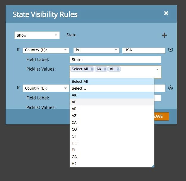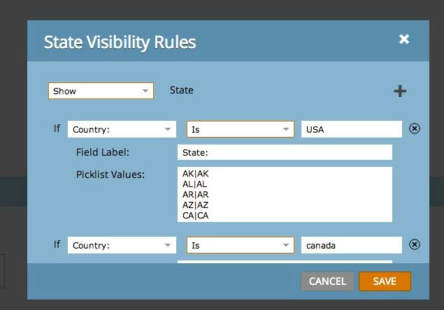 You define the values for the picklists in the modal that controls visibility rules.