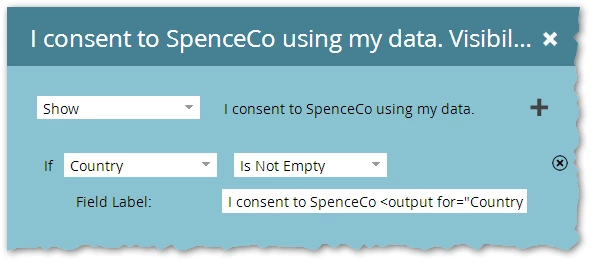 I have a form that asks users to consent to their data being processed by a variable entity based on their country. I need to setup the form so that once a lead selects their country from the dropdown, the in the next field dynamically populates the entity with the country.