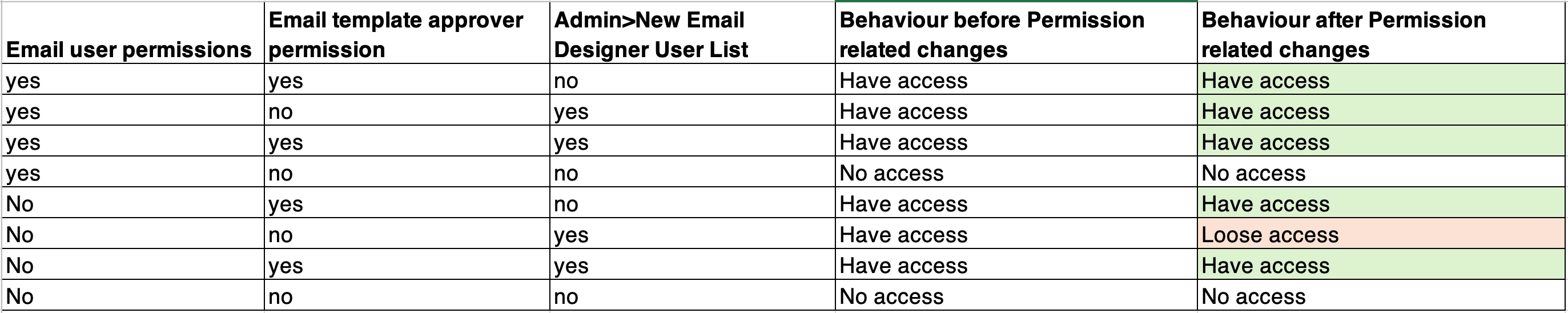 In the past, assets created with the New Email Designer lacked specific granular permissions. With the upcoming changes, all existing email permissions under roles will now apply to these new assets created using New Email Designer (Emails, Email templates, Fragments, etc). Users who require access must be granted the relevant email permissions, such as view, edit, and approve.