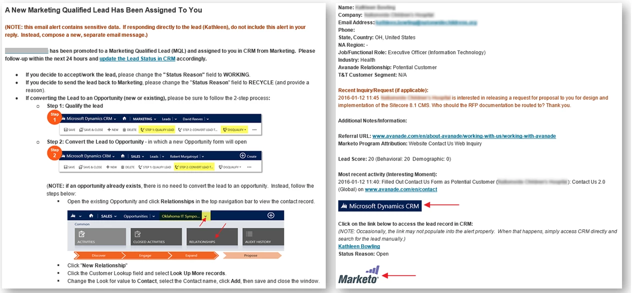 I have very nice MQL alerts that allow our reps to click through directly to the Lead/Contact record in MS Dynamics, and view the Sales Insight window.