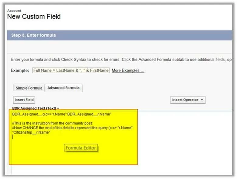 We have trying to create the relationship query inside Salesforce you described above and are running into some issues. Below is the New Custom Field we attempted to create. Can you please tell us what we're doing wrong?