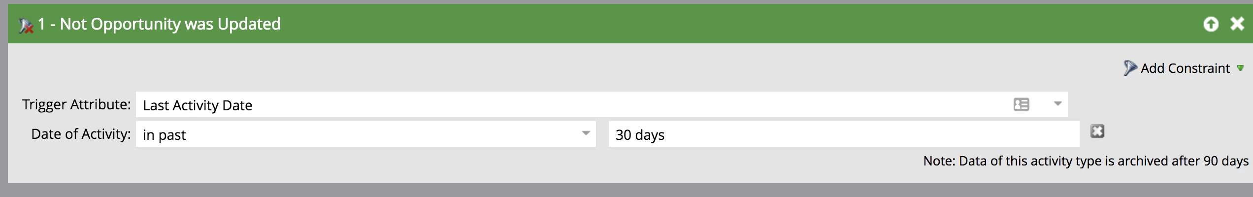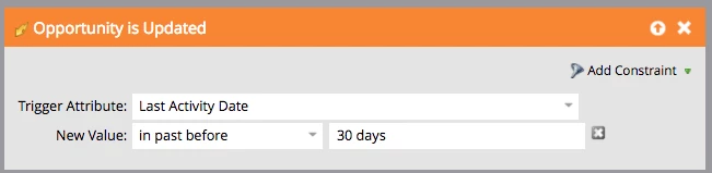 Hoping you can help me with a quick question. I need to send an email based on a trigger of a date field becoming 30 days old. In this case, it's part of the opportunity, "last activity date". The attribute field is NOT changing in this case. If the last date of activity is June 1st, and it isn't touched for 30 days, I need an email to be sent out. In this case, would my screenshot below be the correct way to set it up? The trigger attribute is the last activity date, and the new value is now "in past before" 30 days? Thanks for the help!