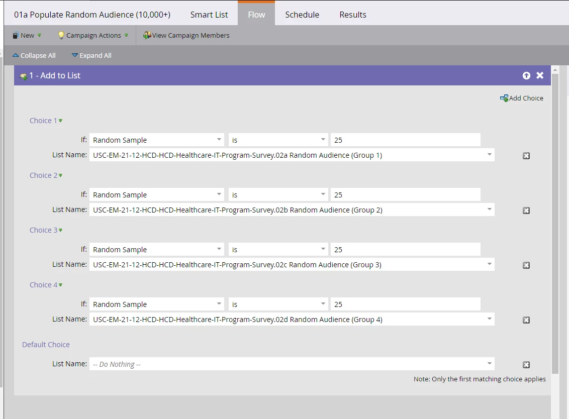 - 01a Invite List – this will be where you import the CSV mentioned above and this will be used in the smart campaign 01a Populate Random Audience (10,000+)’s smart list tab to then break out our random audience groups within this smart campaign’s flow tab