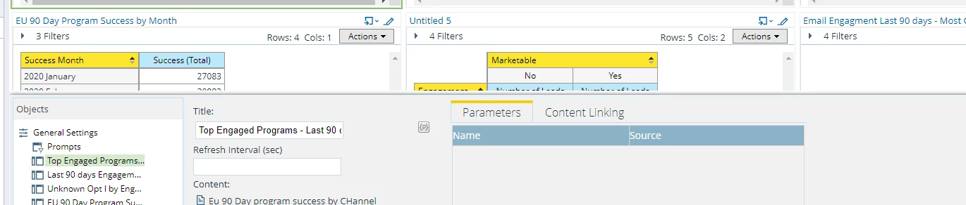 I'm hoping someone can help. I've built a dashboard in RCA. I've already created my 'prompt' but when I choose the individual report to link that prompt too, there's no value in the 'parameters' field.