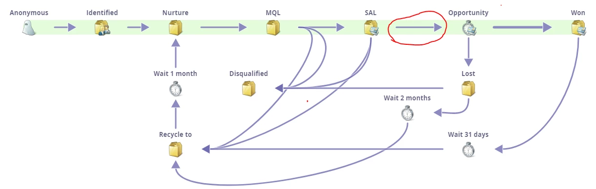 Do you think it should be like the transition from Won => Wait 31 Days is Lifecycle Status New value is Won. Then from Wait 31 days => Recycle to Marketing should be Lifecycle Status New value is Recycle to Marketing? Or is that too vague?