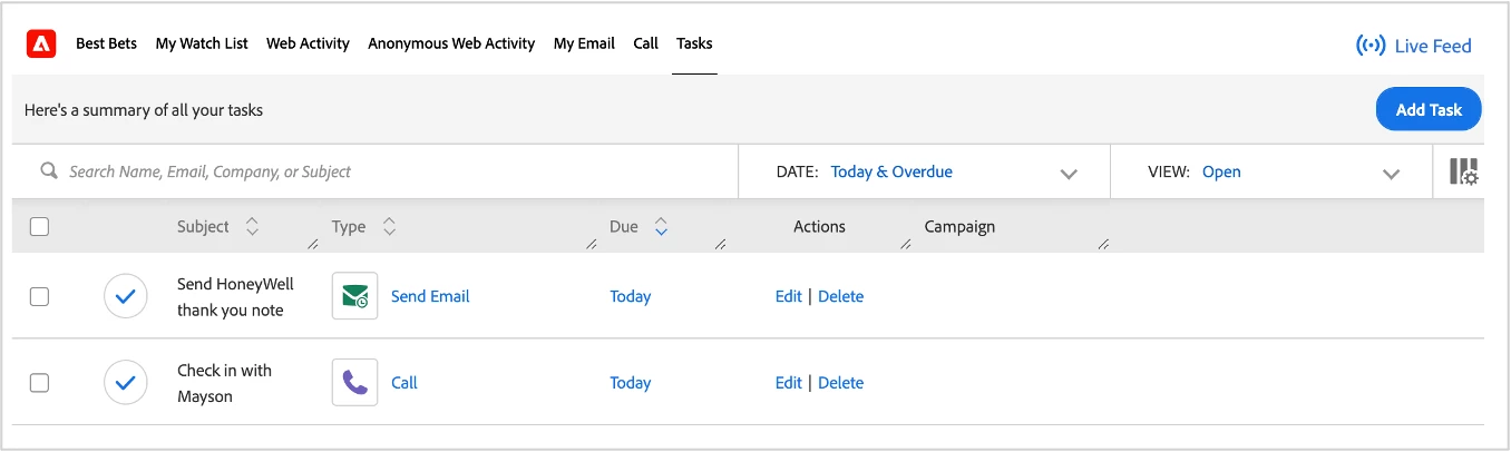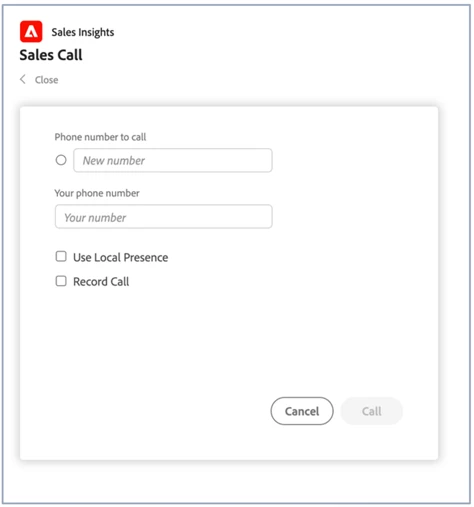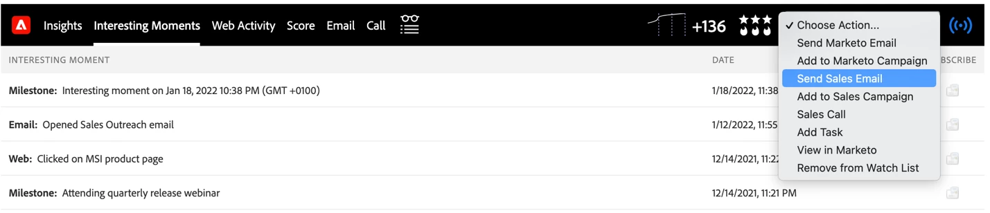 Sales Insight Actions provides reps with multi-step playbooks, customizable email templates, an integrated dialer, and task management tools to facilitate meaningful engagement with customer and prospects, all within Sales Insight and all within the Salesforce CRM. These activities are also tracked in Marketo Engage and can be leveraged via triggers and filters to deliver holistic experiences across both marketing and sales touch points.