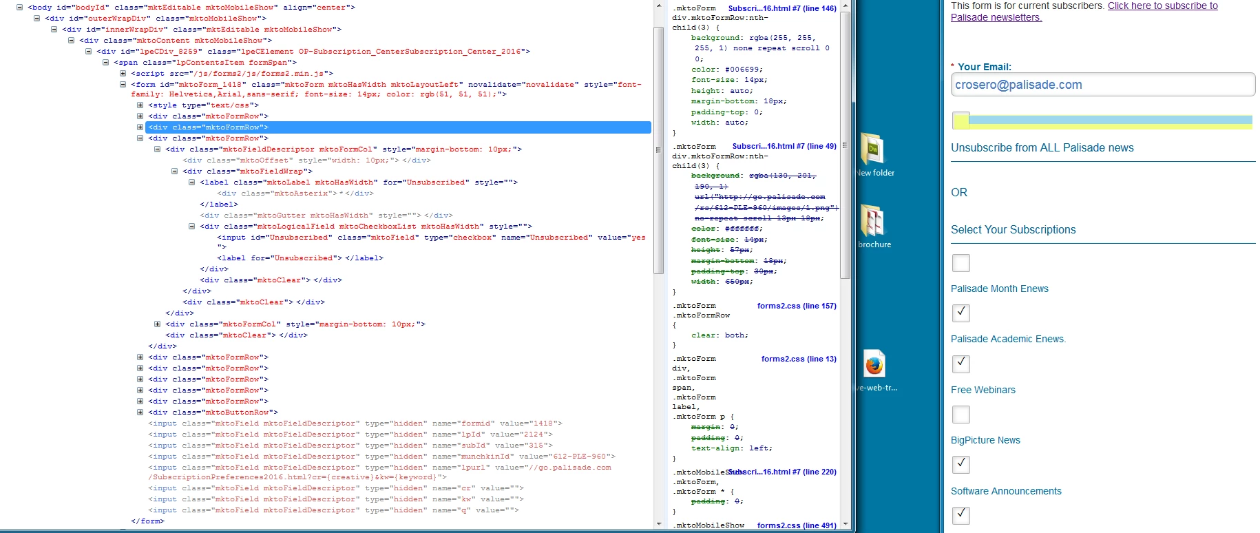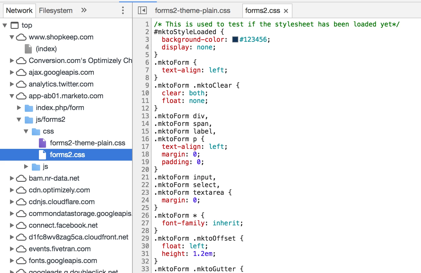 Marketo support initially told us that the styling error on our form is coming from our page, but as you can tell from the attached screenshot, the forms2.css stylesheet is clearly being referenced by the form itself and not our page. You can even see the comment in line 1 that says "This is used to test if the stylesheet has been loaded yet" so we think the form is supposed to stop referencing forms2.css once it has been loaded, but for whatever reason, it doesn't clear out properly.