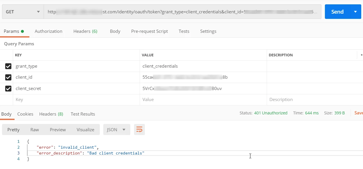 Been checking my client id and secret, all seems to be working when doing the OAuth 2 via Postman, but this expires so I need to get it via API but gives me error like below.
