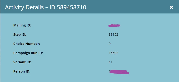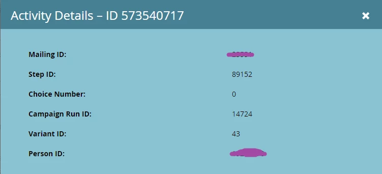 In the front end for these same activities I do see an additional field, Variant ID, that both looks and sounds like it's related to the segmentation: