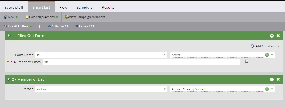 The most pressing issue at the moment is: Some people might have had more than 1 engagement of 10 points since they entered, so I can't do a batch fix for this since everyone would have a different score. There are so many people with different interactions that I'm not sure how to go about this or even how to pull a report of it so I can then put groups into batches depending on how many points they should get. If I could figure out how to pull a report that easily told me how many engagements they should have been scored I think I could come up with a fairly simple solution. For example, if I found 45 people who had 3 engagements that never received 10 points for, I could then create a batch fix campaign that gave them all 30points.