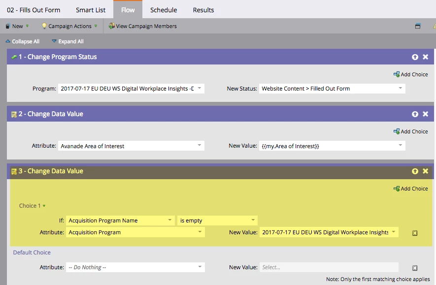| Which of the following is not an example of a flow step? | a. Change Program Status b. Send Email c. Add to SFDC Campaign d. Wait e. Visits Web page | e |