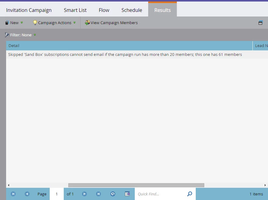 In the results tab I can see the message:- 'Sand Box' subscriptions cannot send email if the campaign run has more than 20 members; this one has 61 members