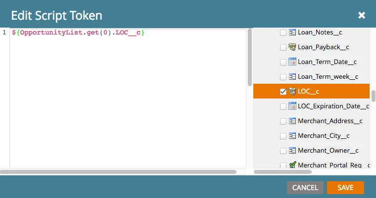 I am trying to create a script token that pulls a field value on the Opportunity Object. This field represents a customer's Line of Credit balance remaining, LOC__c. The screenshot below shows the script when I drag.