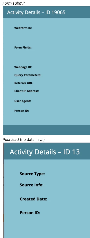Is there a way to get a similar set of activity data as seen in the first of the two screens attached? The first is what we get when using the forms embed which is our current state. The second is what we see when leveraging the post lead api.