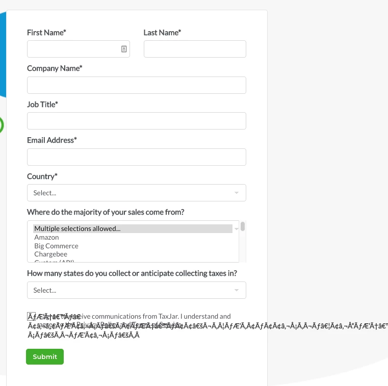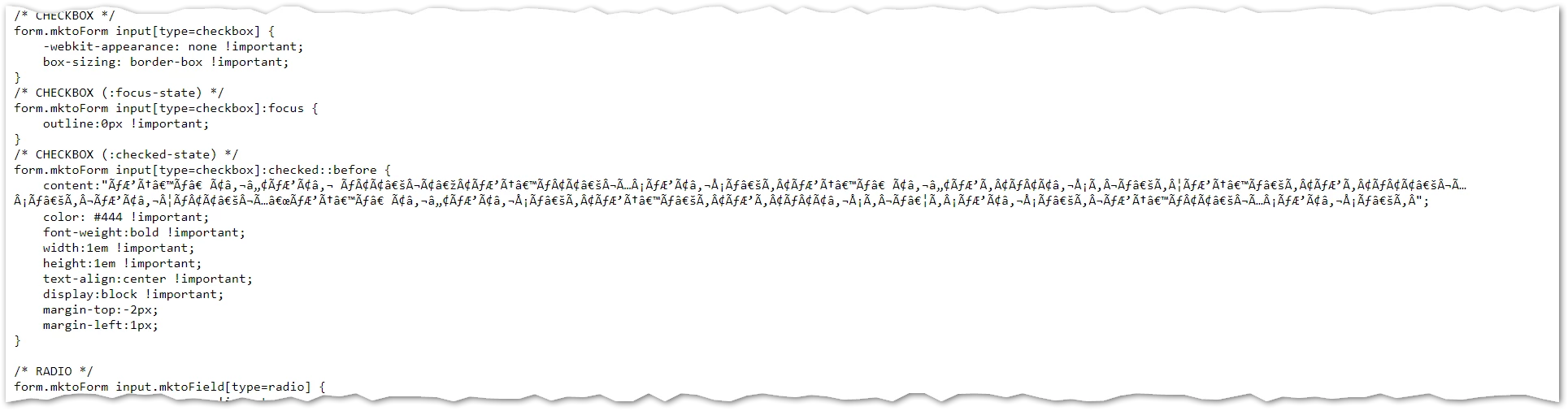 Not sure why this is, but when you select a checkbox on our form, instead of a checkmark, a string of nonsense text appears instead of a checkmark. Sample page: https://go.taxjar.com/2020-WR-ServicePartner-SalesTaxSuccess_LP-01-Request.html