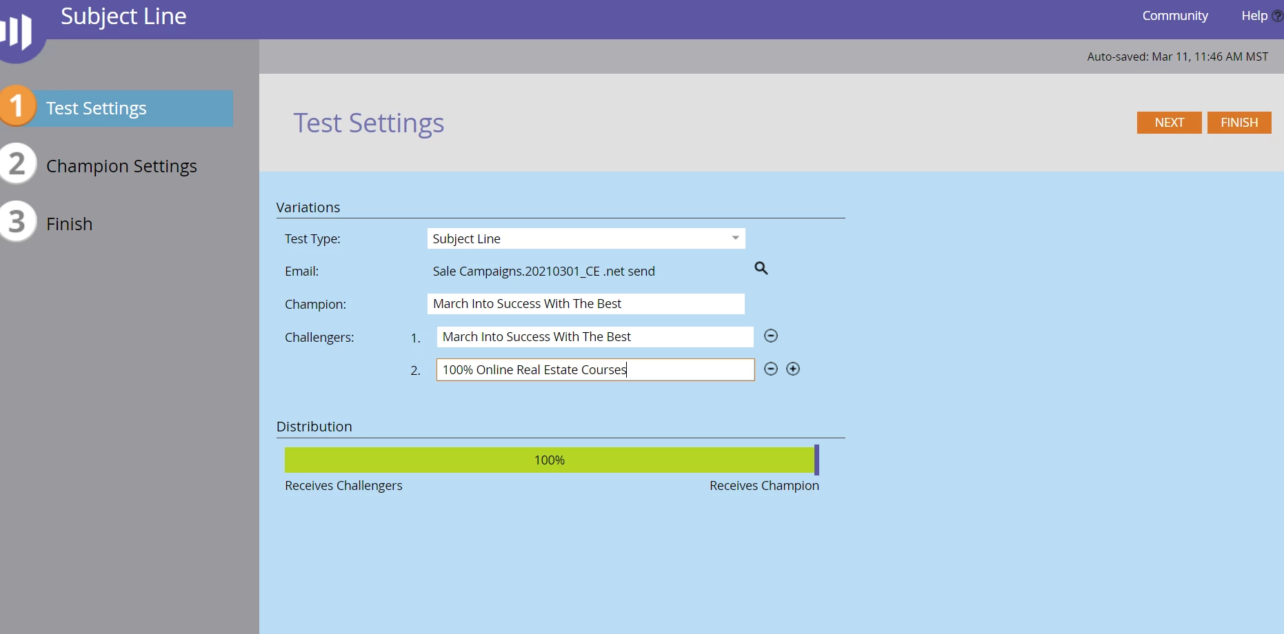 I am trying to set up an A/B split test for the subject line for one of our emails. The Champion/Challenger setup is confusing me a bit. I do not want to send a portion before the actual email send to test, and then send the winner subject line to everyone else. I would like to send this test to 100% and split it evenly 50/50 with the subject lines on the day of the actual send. My question is, if I move it to say 100% receives Challengers like in this screenshot: