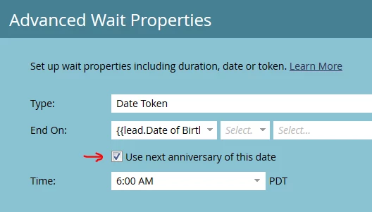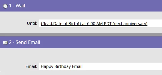 - Add token {{lead.Date of Birth}}. Remember a token can only be used in a trigger campaign.