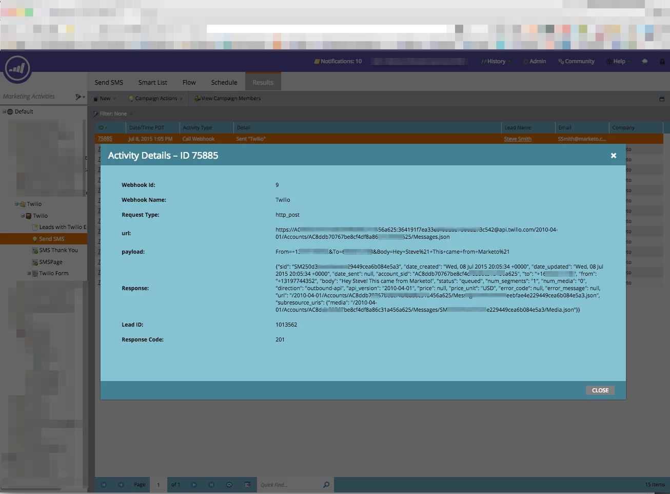 SMS Message - a new string custom field on the Marketo Lead called "Twilio Message"