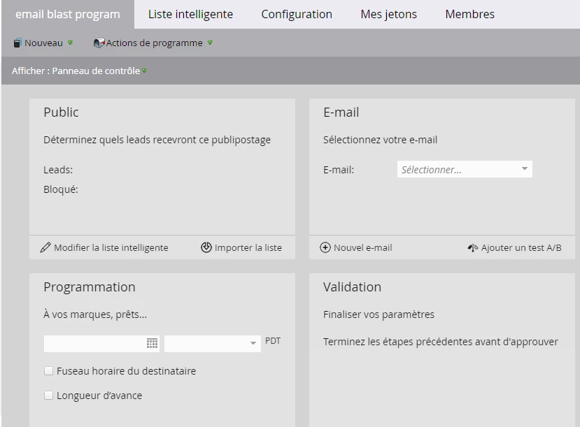 Approbation : Approuver le programme d'e-mailing. Pour approuver votre programme, vous devez avoir un public défini, un e-mail approuvé sélectionné, et l’e-mail programmé ultérieurement. À partir de cette tuile, vous voyez le statut du programme.