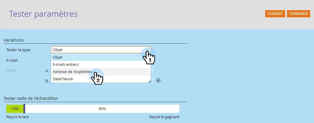 Mise en garde : Si vous utilisez une liste statique, le réglage de la taille de l’échantillon à 100 % envoie l’e-mail à tous les membres de l’audience et le gagnant ne reçoit personne. Si vous utilisez une liste intelligente, le réglage de la taille de l’échantillon à 100 % envoie l’e-mail à tous les destinataires à ce moment-là. Lorsque le programme d’e-mailing est relancé à une date ultérieure, toutes les nouvelles personnes qui se qualifient pour la liste intelligente recevront également l’e-mail puisqu’elles sont désormais incluses dans le public. Il n’est pas recommandé de régler la taille de l’échantillon à 100 %.