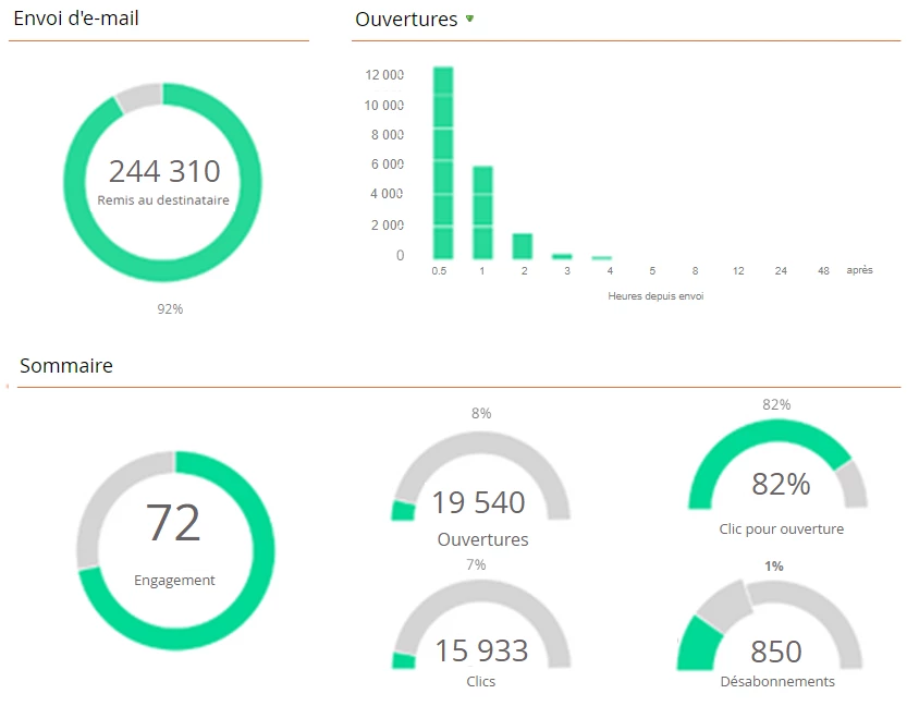 - Rapport sur les performances des e-mails fournit des statistiques standard comme les messages livrés, ouverts, cliqués, etc.