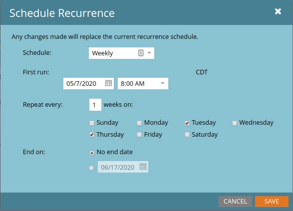 This idea proposes that the schedule request be modified to allow setting of a recurring schedule for the batch campaign, as can currently be done with the GUI as shown in the attached image.