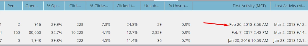 I have attached first activity date, how it displays when filtering by smart campaign and the flow steps involved in sending the message.