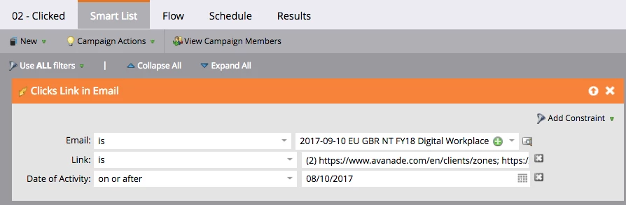 After testing this idea on dozens of different Marketo instances, the single most effective way I’ve found to track email clicks is a combination of two filters: Email was delivered + Visited web page: [web page linked to in email]