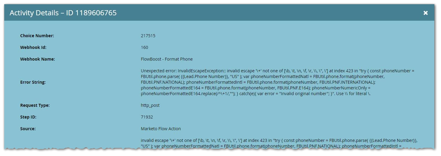 So when pasting the webhook code into Marketo, you need to tweak that \+ so it’s \\+ in the webhook definition: