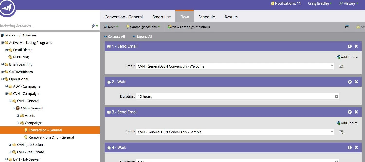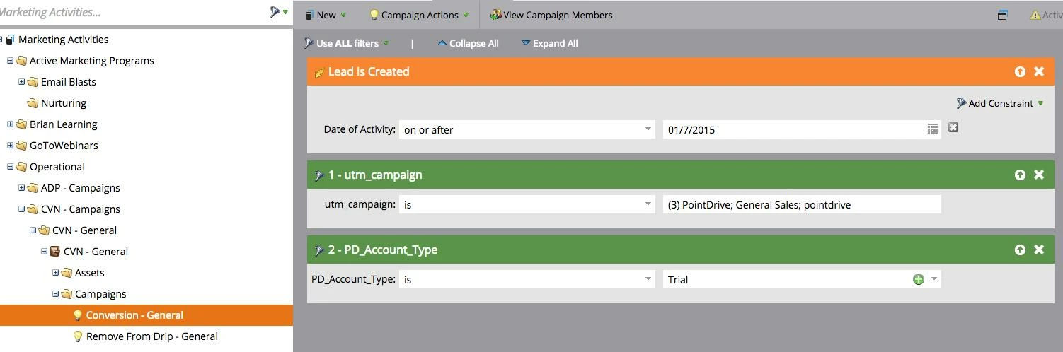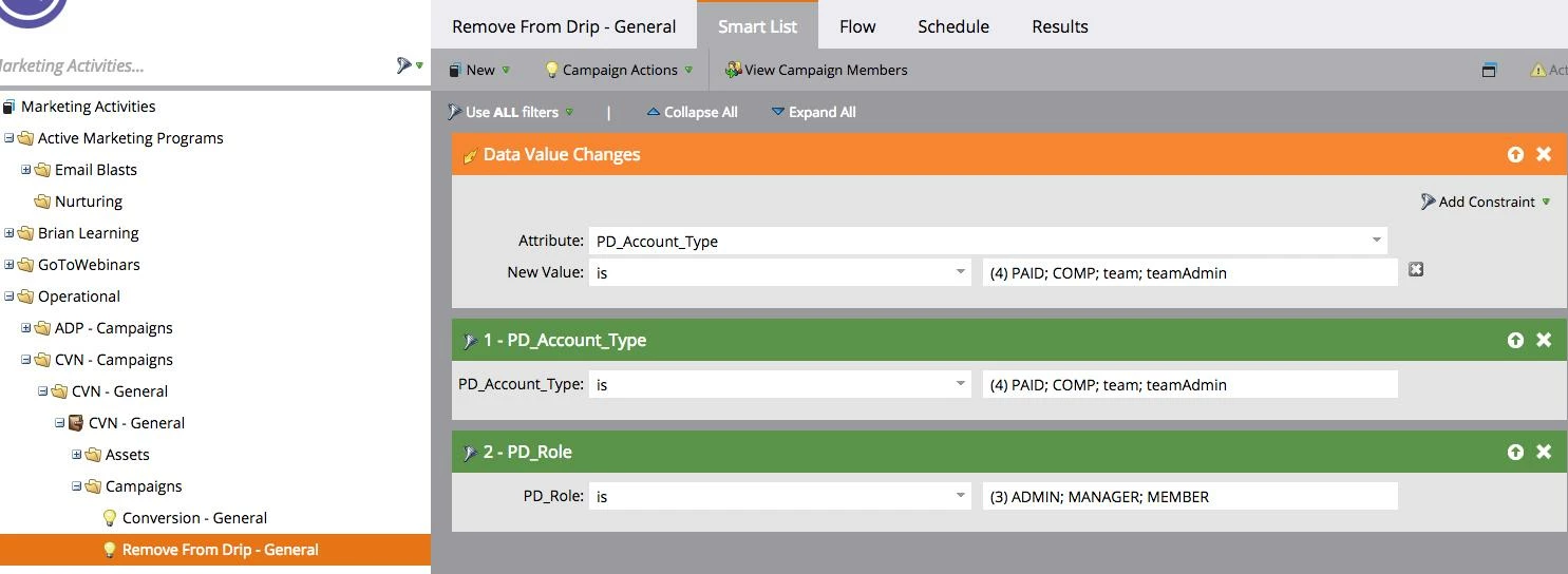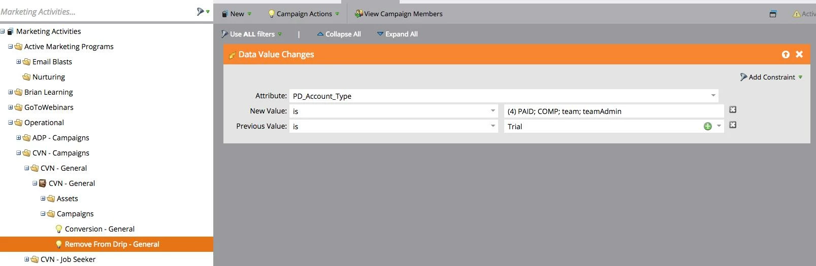 So I have a question for the group. Thought I had this working correctly, but do not. So basically we have a simple onboarding drip campaign for Trial users...the sign up, come in as Trial and they are on there way. What I am trying to do which is not working is that if the users PD_Account_Type Value changes from Trial to Paid they are removed from the Drip Campaign for the free Trial. I am doing this in a seperate smart campaign that I though basically sniffed that out...along with looking for people that have come in Paid, Comp and so on. Issue is they are not getting pulled out of campaign..and I need them to since the are paid and we are asking them to pay/upgrade in later emails. Here are the screen shots of each campaign...