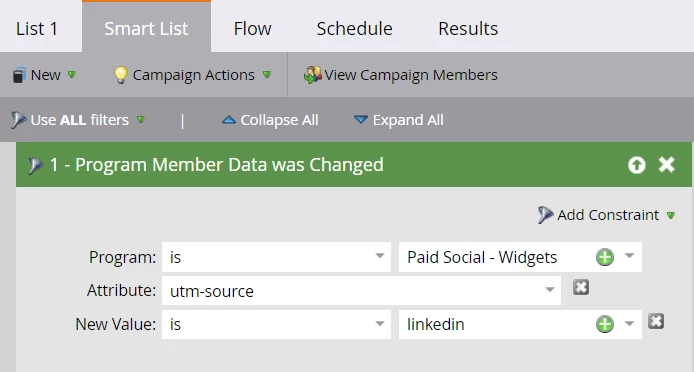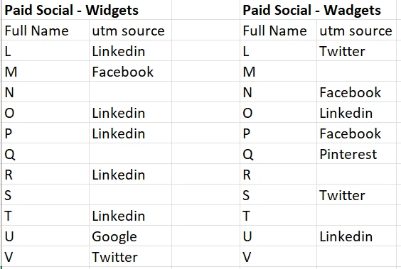 Leana is a marketer tracking where leads are coming from for her Acme social campaigns. utm-source is a program member custom field. She has exported the data from Adobe Marketo Engage for two programs: Paid Social – Widgets and Paid Social – Wadgets. The data can be found below: