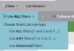 The default for a new Smart List is to use all filters, but you can choose to also use any filter, making your filters into ‘or’ statements, or if you want a combination of the two, you can choose to use Advanced Filters. If using advanced filters, make sure to use parentheses to separate the and and or statements.