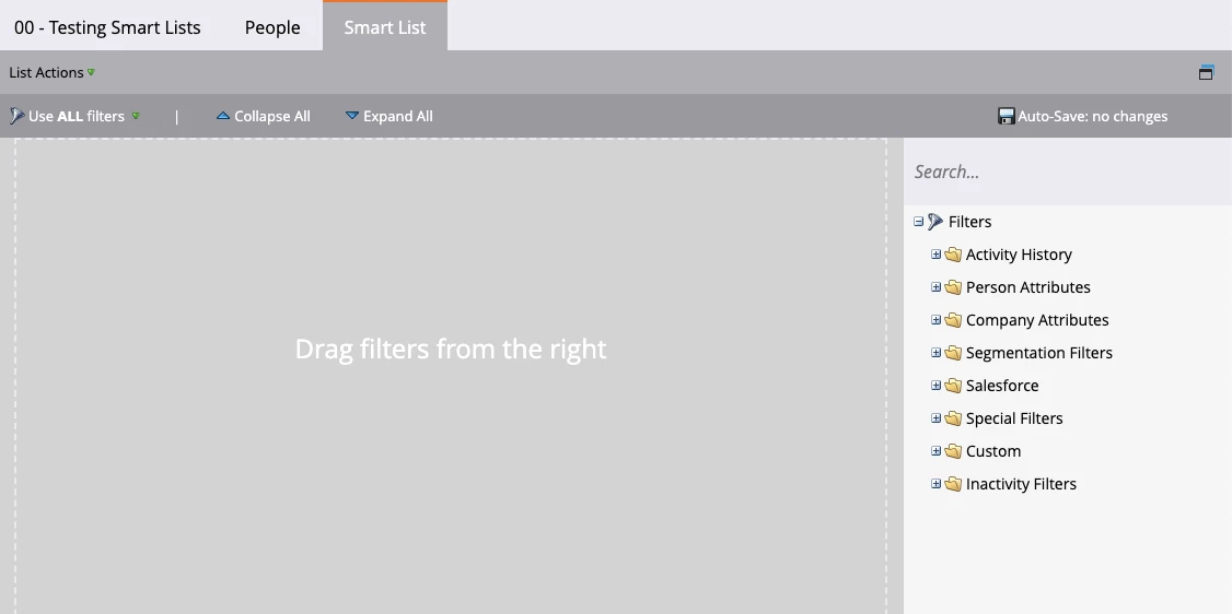 Filters. The most important part of your Smart List will always be your filters. Filters will be dragged over from the right side of the screen within the Smart List tab of your Smart List, and there are myriad filter options:
