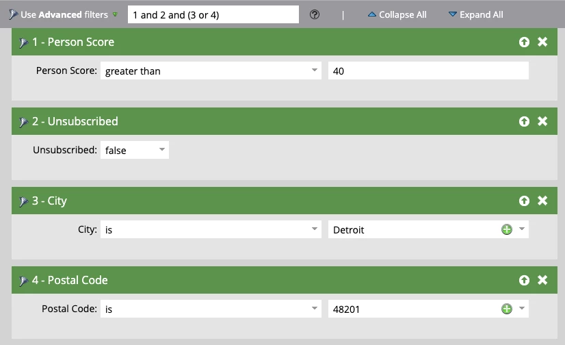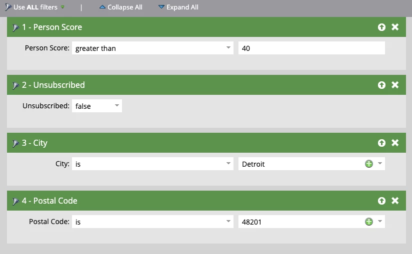 - You are helping a field marketer pull a list of people to invite to an event in the Detroit area. You’ve been asked to pull a list of everyone who has a Person Score above 40 points, is not unsubscribed, and either has a city of Detroit or a zip code of 48201. What would your Smart List filters look like?